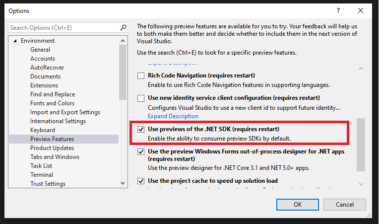 Outro detalhe é que, precisamos habilitar as visualizações do SDK do .NET que instalamos. Então, entre no menu Ferramentas > Opções. Em seguida, vá para o Ambiente > Recursos de Visualização e habilite a opção “Usar visualizações do .NET SDK”.